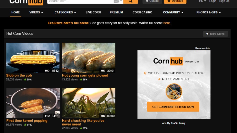 Για πρώτη φορά στην ιστορία, μπορείς να επισκεφθείς το Pornhub και να μην φοβάσαι μην σε πιάσει στα πράσα το αφεντικό ή ο/η σύντροφός σου. Και αυτό γιατί η ιστοσελίδα πορνό μετονομάστηκε για χάρη της Πρωταπριλιάς από Pornhub σε Cornhub, παρουσιάζοντας στην αρχική της σελίδα βίντεο με καλαμπόκια.