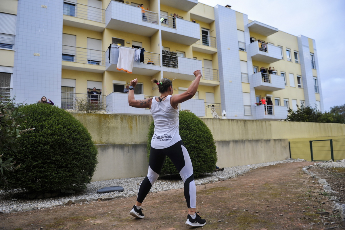 epa08326451 A coach leads a gym class for residents of the Cidade Nova neighborhood in Caldas da Rainha, Portugal, 26 March 2020 (issued 27 March 2020). The coach uses the patio of the condominium and the neighbors do exercises on the balconies. Countries around the world are taking increased measures to stem the widespread of the SARS-CoV-2 coronavirus which causes the Covid-19 disease. EPA/CARLOS BARROSO