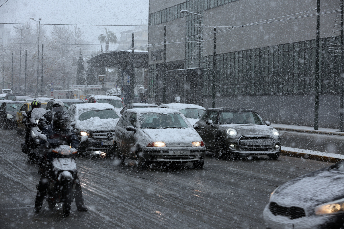 Αυτοκίνητα κινούνται στη Λεωφόρο Συγγρού καθώς πέφτει πυκνό χιόνι, Δευτέρα 24 Ιανουαρίου 2022. Σε πλήρη εξέλιξη βρίσκεται, με πυκνές χιονοπτώσεις στα ανατολικά και νότια, πολύ χαμηλές θερμοκρασίες και ισχυρούς ανέμους στο Αιγαίο, η κακοκαιρία «Ελπίς» που αναμένεται να ενταθεί τις επόμενες ώρες. ΑΠΕ-ΜΠΕ/ΑΠΕ-ΜΠΕ/Αλέξανδρος Μπελτές