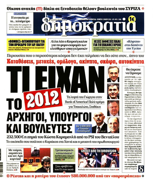 Η εφημερίδα γράφει ότι: «με τέσσερα χρόνια καθυστέρηση και με δευτερεύουσες καινοτομίες δόθηκαν χθες στη δημοσιότητα τα «πόθεν έσχες» των υπόχρεων βουλευτών και ευρωβουλευτών του οικονομικού έτους 2013, χρήσης 2012».