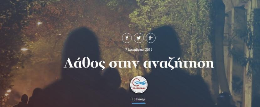 Το Ποτάμι έσπευσε να εκδόσει επανορθωτική ανακοίνωση υπό τον τίτλο «Λάθος στην αναζήτηση», στην οποία αναφέρει πως «στο προηγούμενο δελτίο τύπου εκ παραδρομής συμπεριλήφθηκαν δηλώσεις του κ. Τσίπρα και προβεβλημένων στελεχών του ΣΥΡΙΖΑ από τα προηγούμενα χρόνια. Η αλήθεια είναι ότι ο κ.Τσίπρας και η κυβέρνησή του δεν σχολίασαν τα όσα θλιβερά έγιναν στην Αθήνα και σε άλλες πόλεις της Ελλάδας το Σαββατοκύριακο. Λόγω, λοιπόν, της απουσίας πρόσφατων δηλώσεων οι μηχανές αναζήτησης όταν πληκτρολογείς “βία – μολότοφ – δηλώσεις ΣΥΡΙΖΑ”, εμφανίζουν αναρτήσεις από τα χρόνια της αντιπολίτευσης. Δεν έχουν τη νοημοσύνη να αντιληφθούν ότι ο ΣΥΡΙΖΑ είναι πλέον κυβέρνηση».