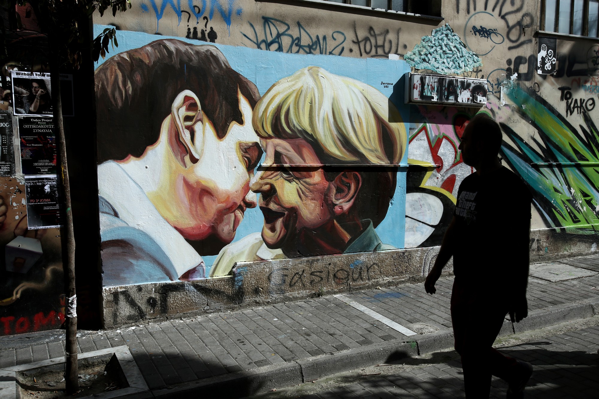 Στο γνωστό δρόμο! Εκεί που στέκεται και ο ήρωας-σκύλος Λουκάνικος, ήρθε ένα νέο graffiti για να κοσμήσει τη Ρήγα Παλαμήδου στου Ψυρρή. Οι διαβάτες της περιοχής τώρα θα αντικρίσουν κάτι πιο γλυκό από τον σκύλο. Η ένωση δύο ανθρώπων πάντα είναι κάτι το συγκινητικό. Ειδικά αν είναι διαφορετικής ηλικίας, χρωμάτων και εθνικότητας. Το έργο είναι της ομάδας Jupiterfab.