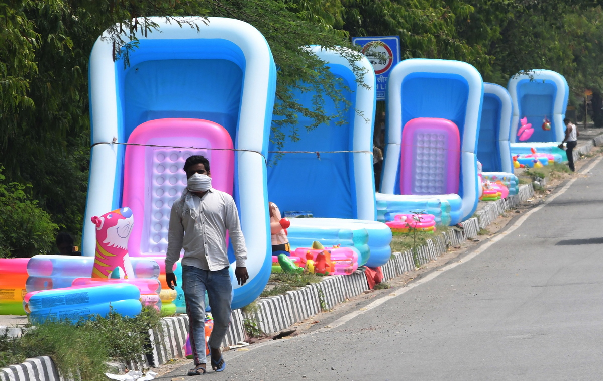 epa08462317 A man walks past inflatable items for sale on a roadside amid an easing of coronavirus lockdown measures, in New Delhi, India, 03 June 2020. According to media reports, the Indian government has decided to provide some relaxation in the ongoing lockdown which will continue through 30 june 2020. Restrictions will be eased in a phased manner with places of worship, hospitality services and shopping malls scheduled to be opened in the initial phase. The areas termed as 'containment zones' will be identified by authorities and will remain under complete lockdown. EPA/STR
