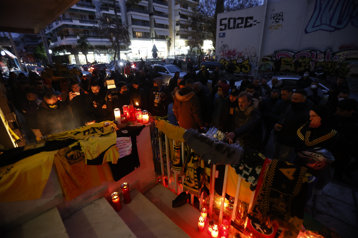 Κόσμος βρίσκεται συγκεντρωμένος στο σημείο όπου δολοφοθήθηκε ο 19χρονος Άλκης Καμπανός, πριν την έναρξη του αγώνα Άρης - ΑΕΚ για την 21η αγωνιστική της Super League, στο γήπεδο Κλεάνθης Βικελίδης, στην Θεσσαλονίκη, την Τετάρτη 02 Φεβρουαρίου 2022. ΑΠΕ-ΜΠΕ/ΑΠΕ-ΜΠΕ/ΔΗΜΗΤΡΗΣ ΤΟΣΙΔΗΣ