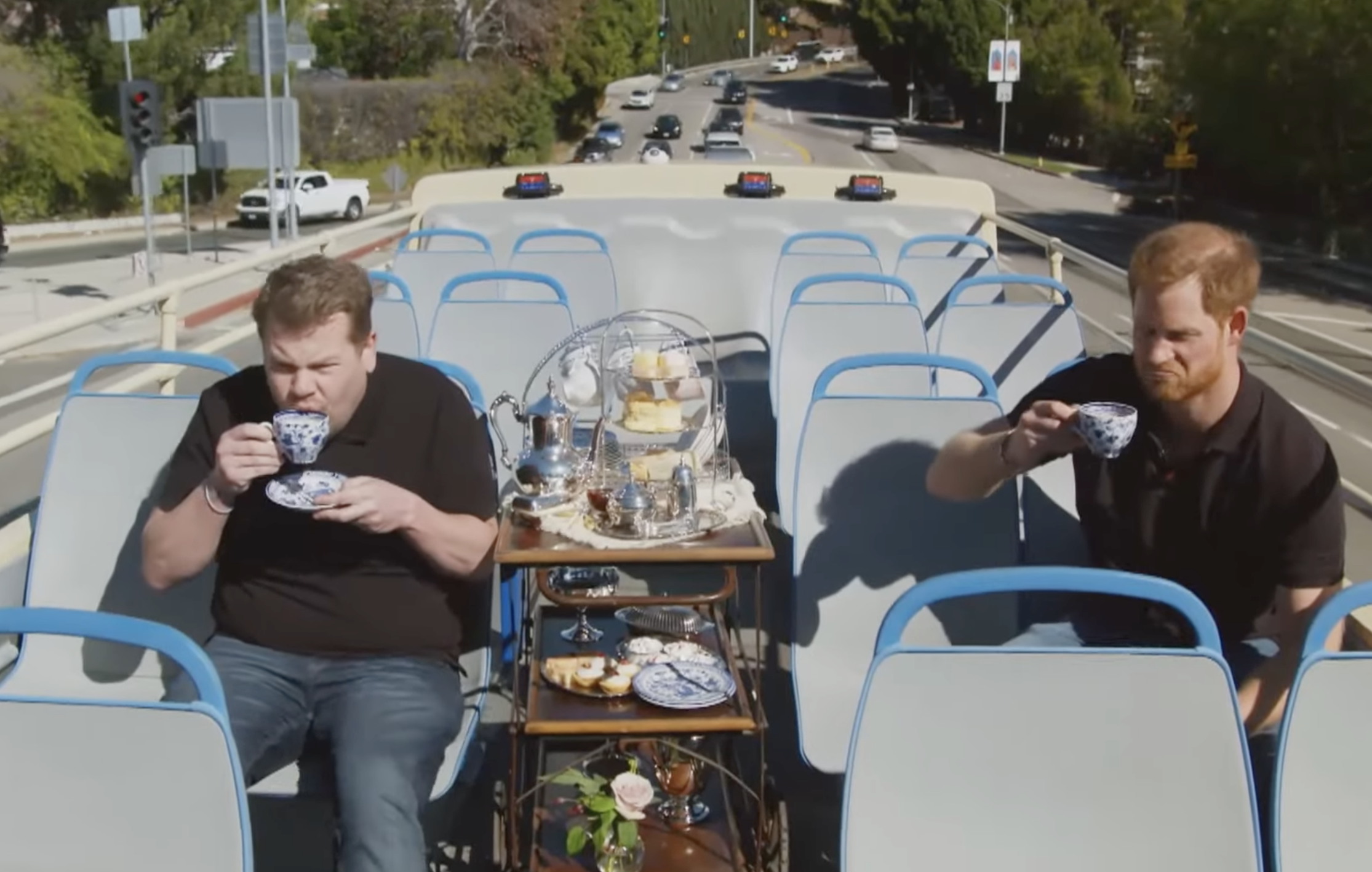 Ο Χάρι και ο Κόρντεν γύρισαν μάλιστα το μεγαλύτερο μέρος της συνομιλίας τους πάνω σε τουριστικό λεωφορείο, το οποίο περνούσε από σπίτια διασήμων στο Λος Άντζελες. Έκαναν μάλιστα και μια στάση στην έπαυλη που γυρίστηκε το “The Fresh Prince of Bel Air”, ο Χάρι επισκέφθηκε την τουαλέτα κάνοντας χιούμορ, ενώ μίλησε και μέσω FaceTime με τη Μέγκαν.