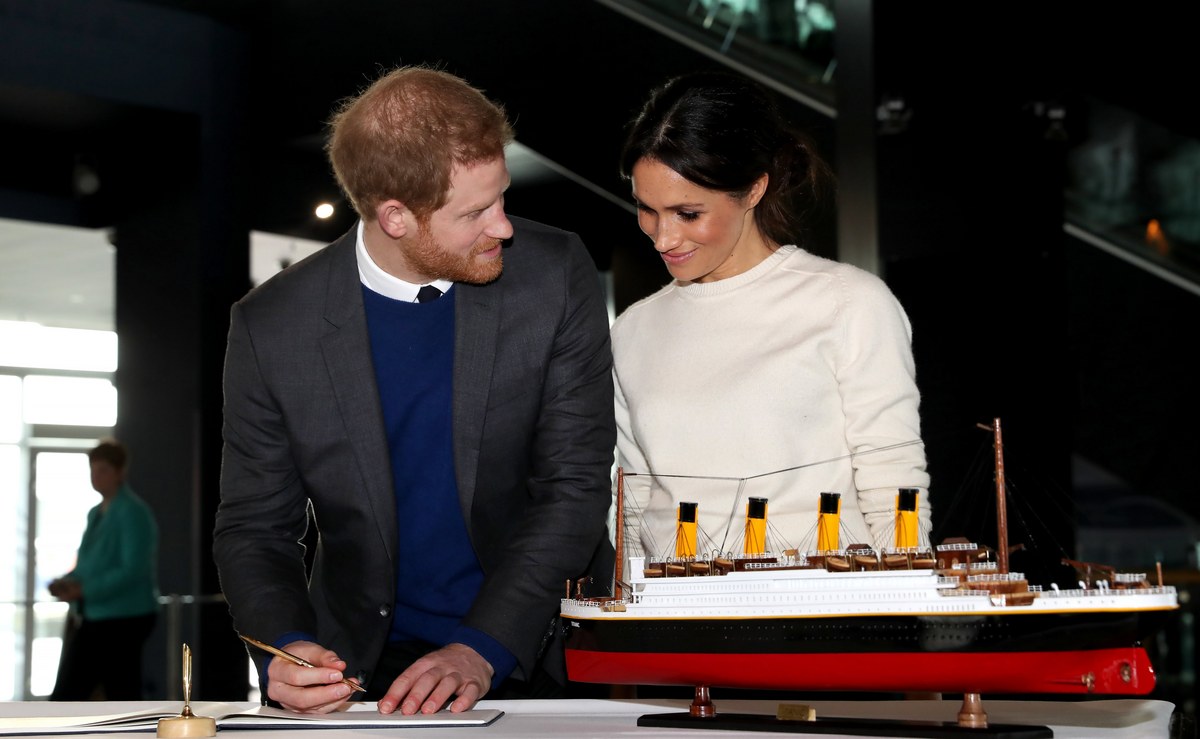 epa06624273 Prince Harry and Meghan Markle sign a guest book at the Titanic Visitors Centre in Belfast , Northern Ireland, 23 March 2018. Britain's Prince Harry and his fiance came for a one-day visit. The Couple were guided through the venue’s interactive galleries, which explore the sights, sounds, smells and stories of RMS Titanic, as well as the city and people who made her. During the visit, they also heard about how the regeneration of the Titanic Quarter has provided Belfast with an exciting new urban space. EPA/William Cherry / NIO Office / POOL