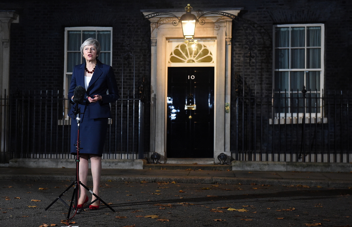 epaselect epa07165538 British Prime Minister Theresa May gives a statement outside Downing Street No 10 in London, Britain, 14 November 2018. Theresa May said Cabinet has backed the draft Brexit withdrawal agreement. EPA/ANDY RAIN
