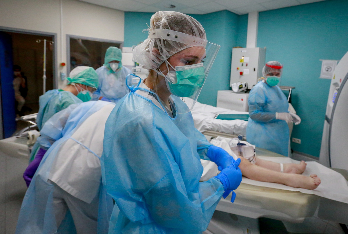 epa08759140 A patient with Covid-19 is cared for by the nursing staff in order to perform a lung scan at the Etterbeek-Ixelles site of the Iris Sud Hospitals in Brussels, Belgium, 20 October 2020. Belgium is witnessing a rise in coronavirus infections prompting the government to impose new restrictions that came into effect on 19 October including the closure of bars and restaurants for four weeks. EPA/STEPHANIE LECOCQ
