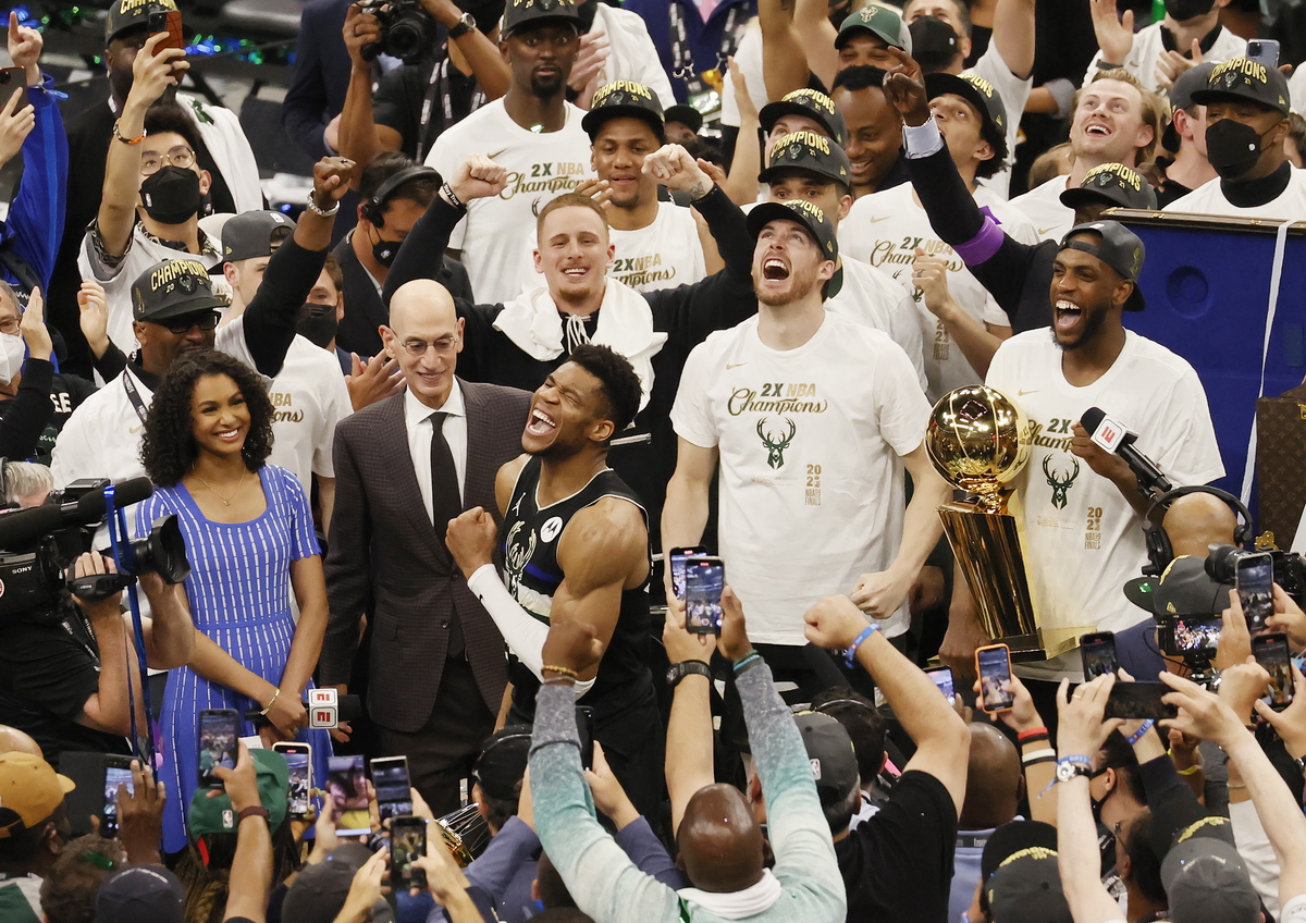 epa09355830 Milwaukee Bucks forward Giannis Antetokounmpo (C) reacts in front of NBA Commissioner Adam Silver (L) at the conclusion of game six of the NBA Finals basketball series between the Phoenix Suns and the Milwaukee Bucks at Fiserv Forum in Milwaukee, Wisconsin, USA, 20 July 2021. EPA/TANNEN MAURY SHUTTERSTOCK OUT