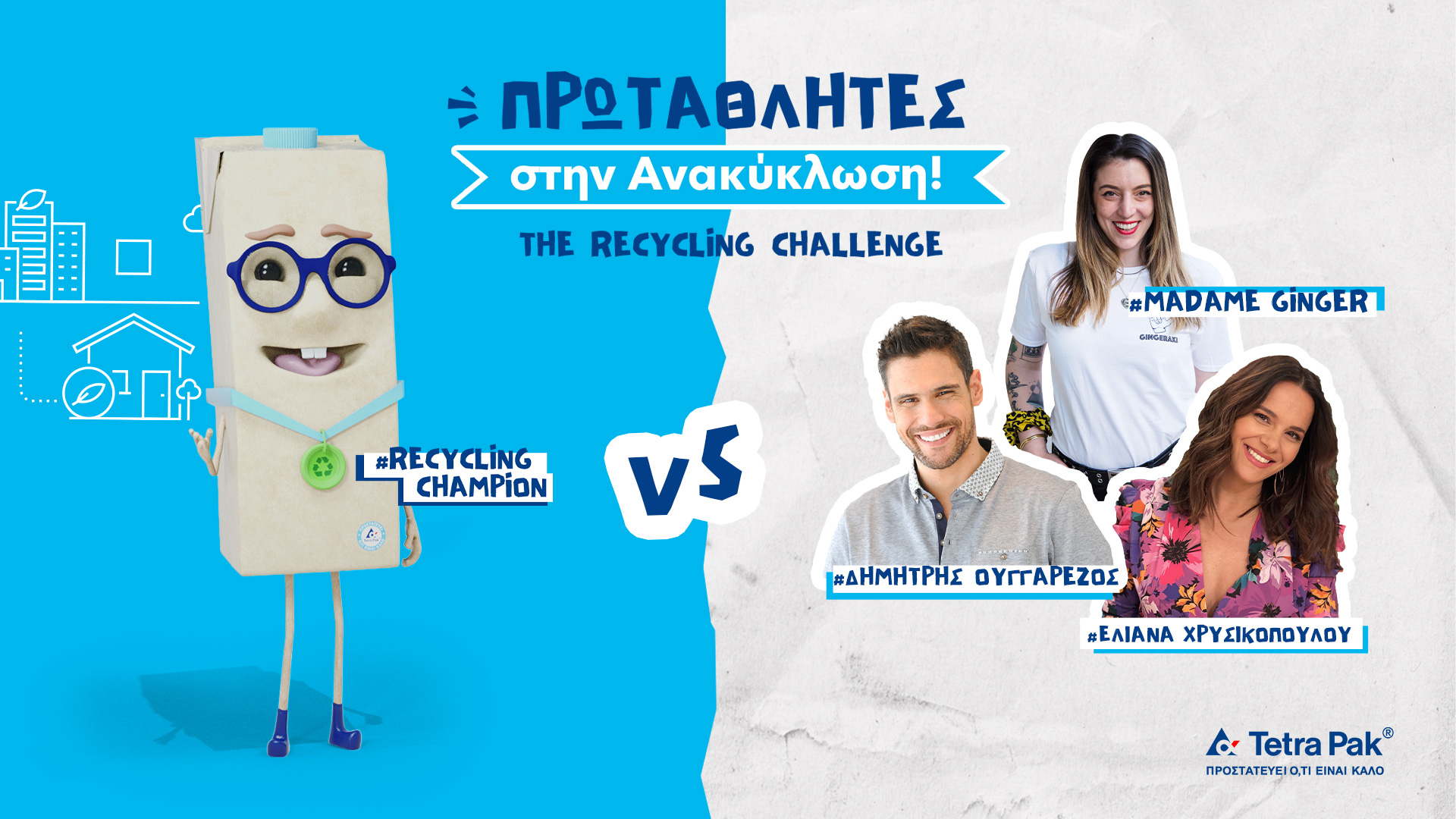Όμως ο Recycling Champion δεν είναι μόνος του. Παρέα του, η Madame Ginger, ο Δημήτρης Ουγγαρέζος και η Ελιάνα Χρυσίκοπουλου κάνουν το παιχνίδι ακόμη πιο συναρπαστικό!