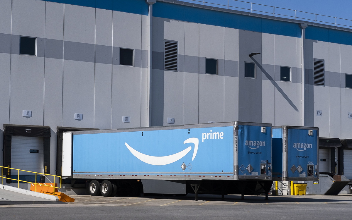 epa09537190 Trucks at an Amazon fulfillment center where organizers are planning to file for a union election next week after gathering more than 1,700 employee signatures in the borough of Staten Island in New York, New York, USA, 21 October 2021. If the National Labor Relations Board signs off on the unionization request, Amazon employees at this location will hold a unionization vote, the second such vote by Amazon employees in the US this year. EPA/JUSTIN LANE