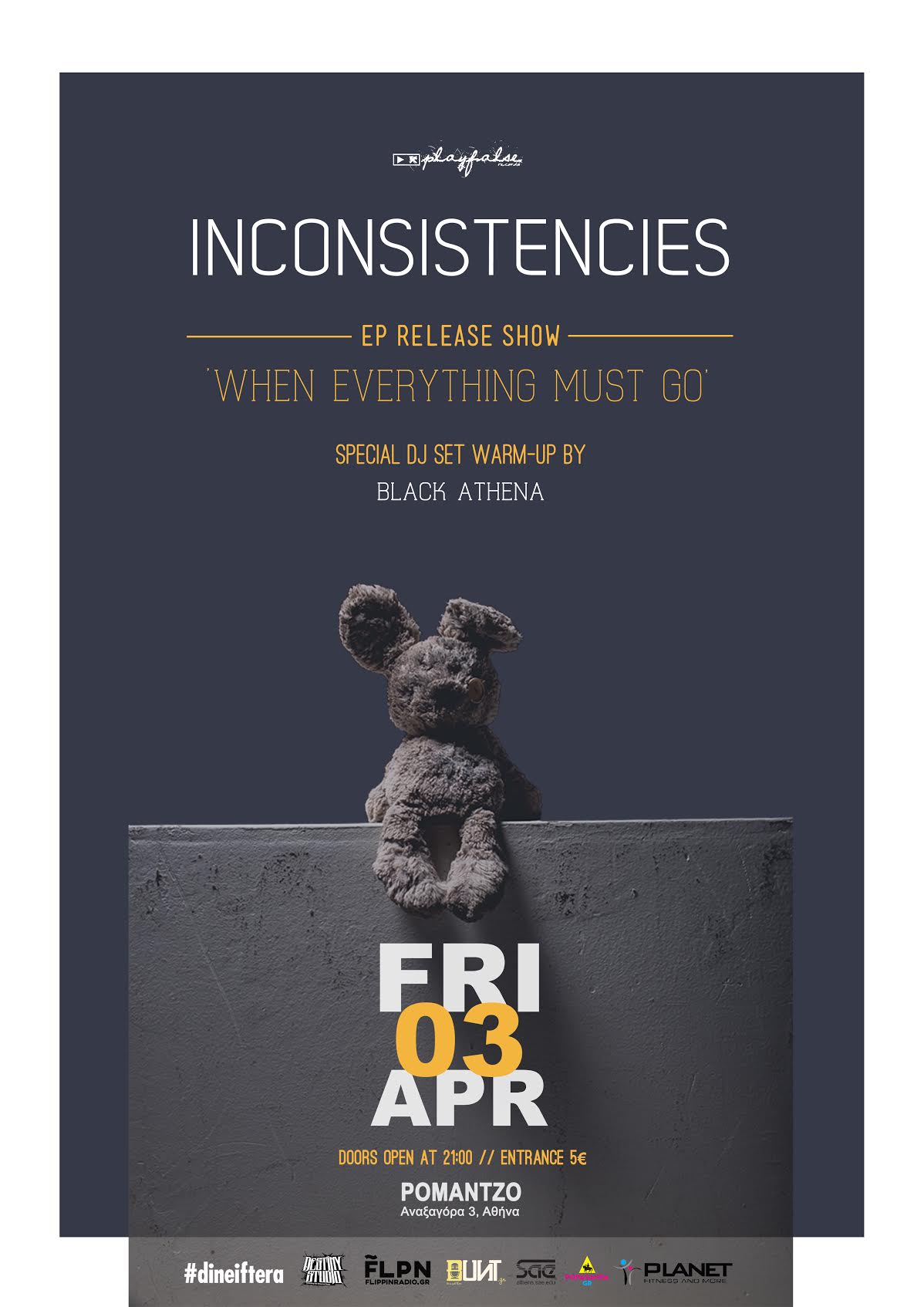 Toν Σεπτέμβριο, οι Inconsistencies ταξίδεψαν στο Λονδίνο, με αφορμή την ηχογράφηση του ντεμπούτου τους EP, ‘When Everything Must Go’, η οποία πραγματοποιήθηκε στα Red Bull Studios. Ο ήχος κυμαίνεται σε acoustic – alternative rock διάθεση, με κάποια από τα κομμάτια να ξυπνάνε upbeat χορευτικά ένστικτα, ενώ άλλα να φέρνουν σε νοσταλγικά late summer απογεύματα. Το EP θα κυκλοφορήσει από την Playfalse Records και η παρουσίασή του θα γίνει την Παρασκευή 3 Απριλίου 2015 στο Ρομάντσο (Αναξαγόρα 3, Αθήνα). Το show θα ζεστάνουν με Dj Set οι Black Athena, μέσα από τους funk, soul, floating beats, abstract hip hop ρυθμούς τους.