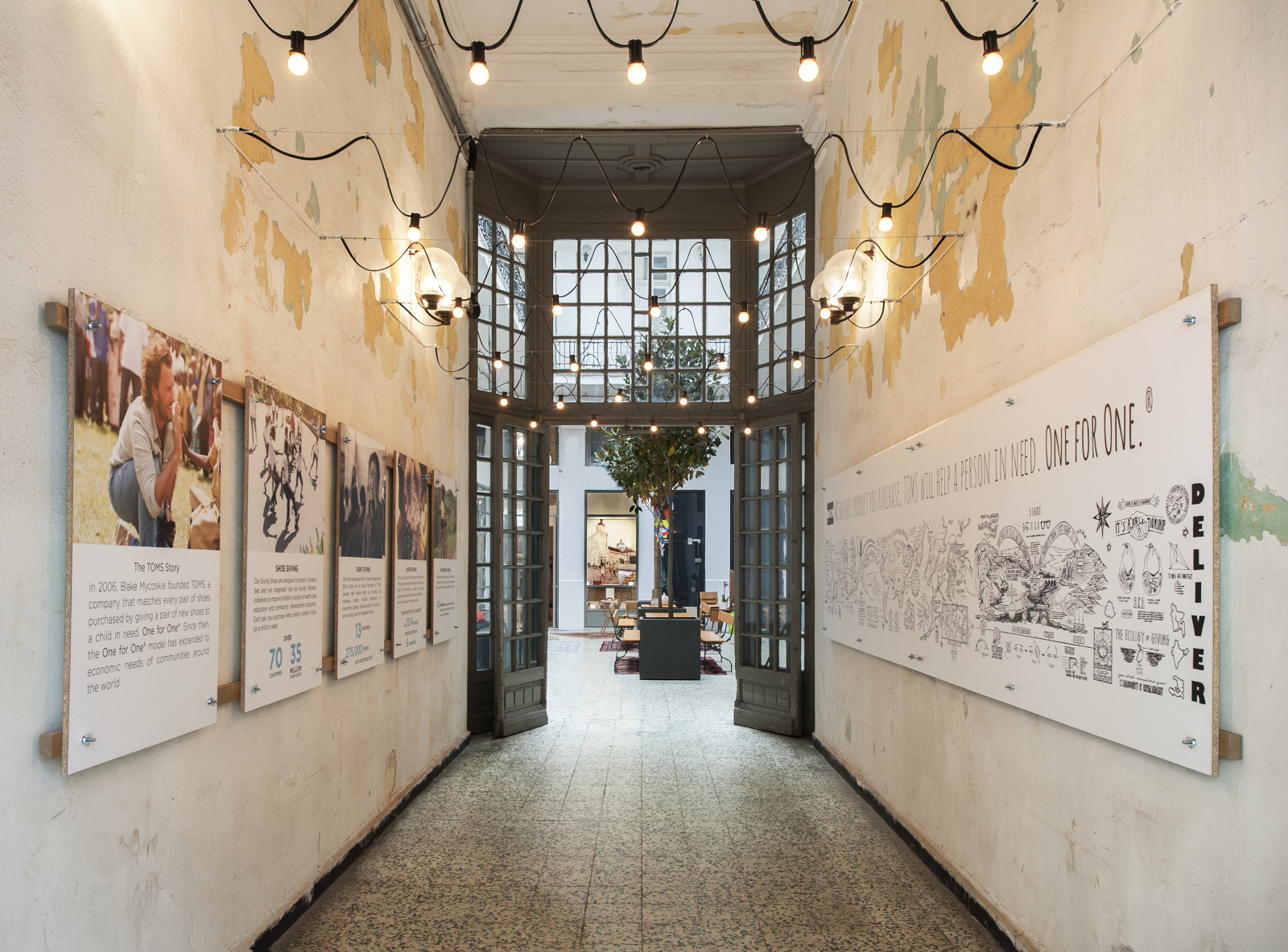 Το κατάστημα – πολυχώρος φιλοξενεί την ολοκληρωμένη σειρά προϊόντων της TOMS: τα αγαπημένα παπούτσια και γυαλιά για Άνοιξη/Καλοκαίρι 2015 καθώς και την νέα σειρά One for One® από τσάντες – για γυναίκες και άντρες – με την αγορά των οποίων η TOMS βοηθά μια μητέρα να γεννήσει με ασφάλεια.