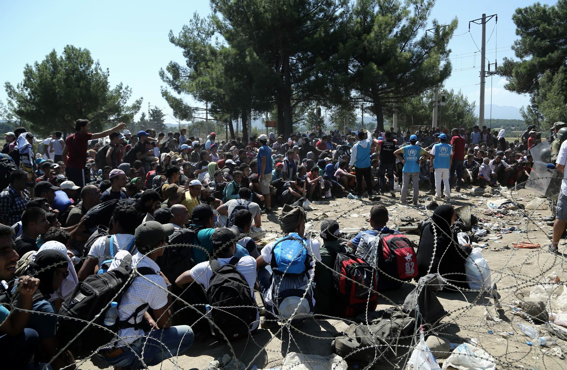 Σύροι πρόσφυγες συγκεντρωμένοι μπροστά από τα συρματοπλέγματα στα σύνορα Ελλάδας - ΠΓΔΜ. Προσπαθούν να περάσουν στο χωριό Γευγελή της ΠΓΔτΜ, προκειμένου να συνεχίσουν το ταξίδι τους με το τρένο προς την κεντρική και βόρεια Ευρώπη. Τρίτη 2 Σεπτεμβρίου 2015.