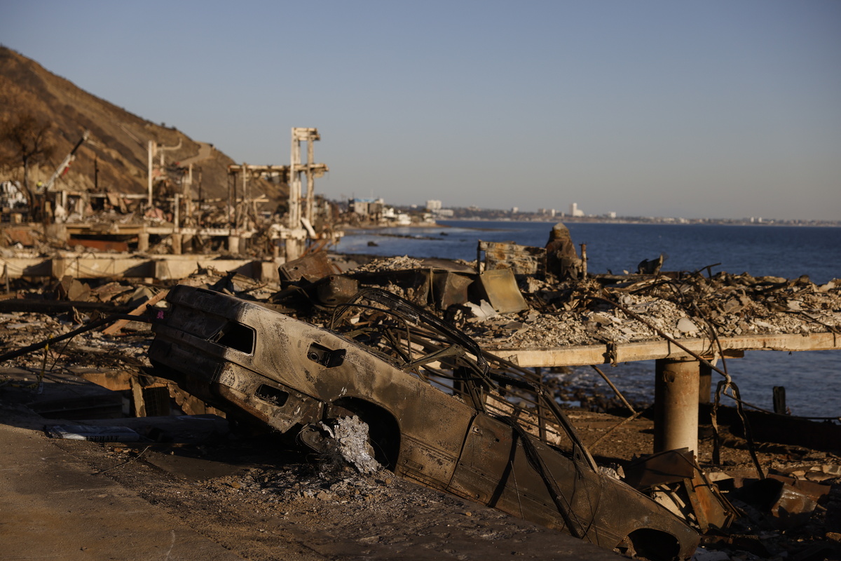 epaselect epa11827427 The remains of a car hang on a cliff overlooking the ocean in the Pacific Palisades neighborhood in Los Angeles, California, USA, 15 January 2025. According to the National Weather Service, much of Southern California is under an elevated fire risk, as the Santa Ana winds have returned and are predicted to affect the area. The Los Angeles County Medical Examiner's Office has stated that the suspected death toll from the Los Angeles fires now stands at 25 as search and rescue teams, both local and abroad, search the affected fire areas. EPA/CAROLINE BREHMAN