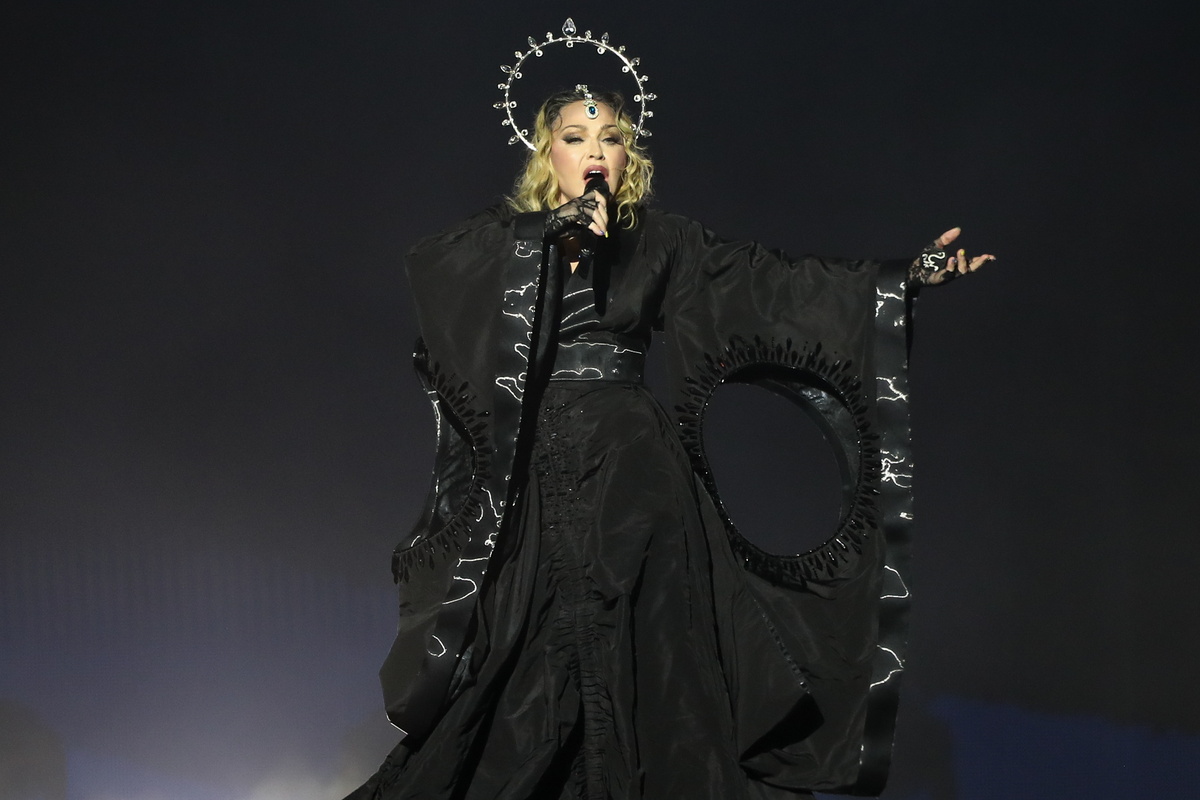 epa11318998 US singer Madonna performs during a free concert, the only presentation of 'The Celebration Tour' in South America, on Copacabana beach in Rio de Janeiro, Brazil, 04 May 2024. EPA/ANDRE COELHO