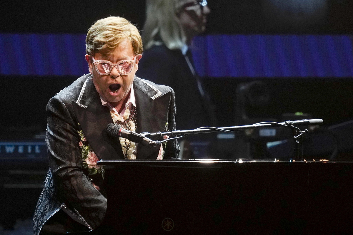 epa10646592 British singer Elton John performs during a concert at the Palau Sant Jordi arena in Barcelona, Spain, 22 May 2023. Elton John will perform twice in Barcelona, as part of his tour Farewell Yellow Brick Road. EPA/ENRIC FONTCUBERTA