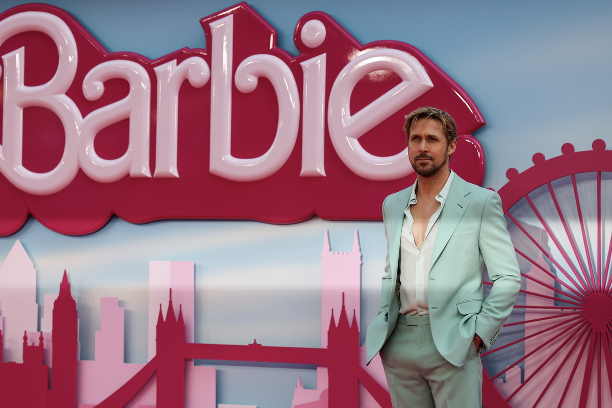 epa10742464 Canadian actor Ryan Gosling poses on the pink carpet at the European premiere of 'Barbie' in central London, Britain, 12 July 2023. The film will be released in cinemas from 21 July 2023. EPA/ANDY RAIN