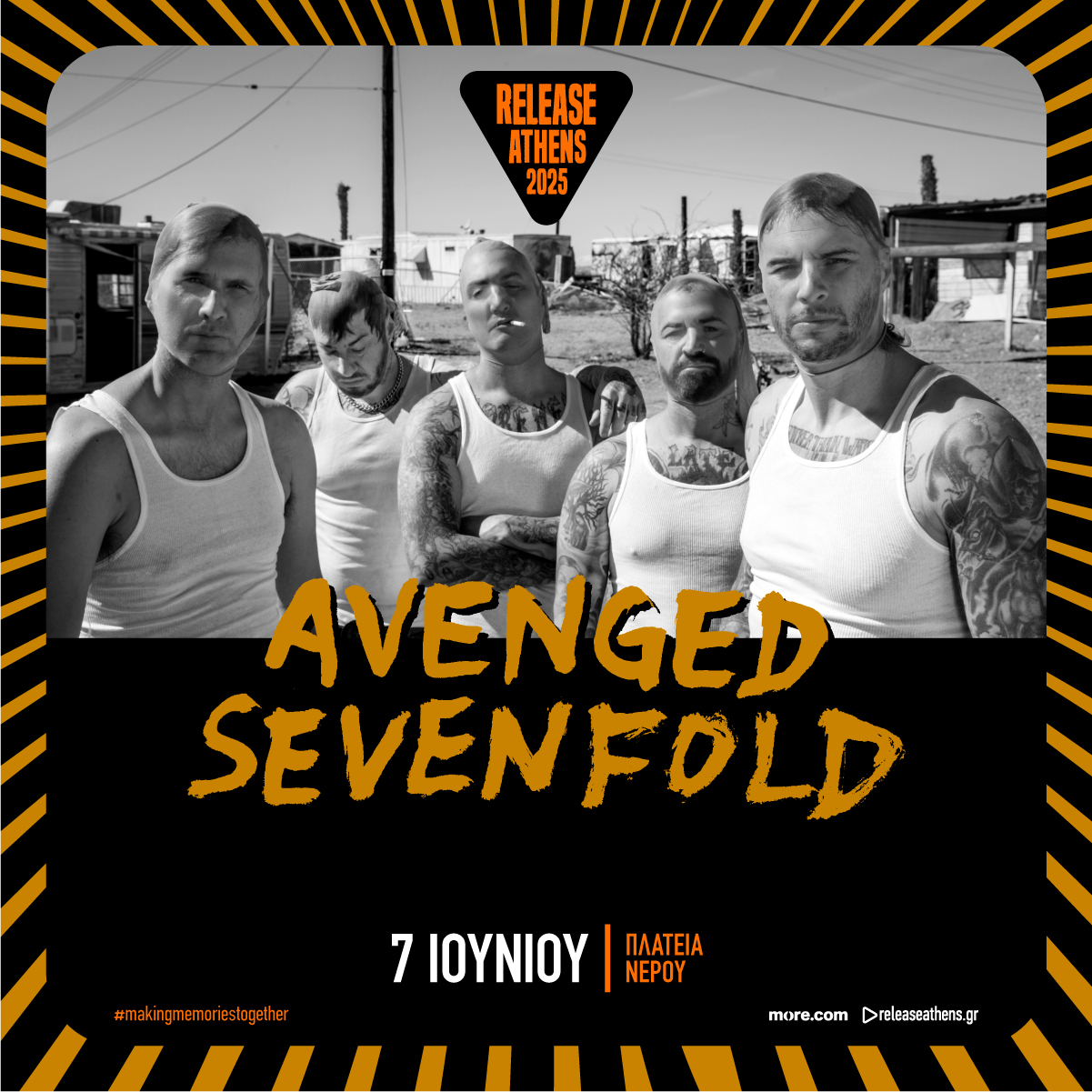 Το Release Athens 2025 υποδέχεται τους Avenged Sevenfold, το Σάββατο 7 Ιουνίου, στην Πλατεία Νερού. Το θρυλικό συγκρότημα από την Καλιφόρνια ετοιμάζεται για την πρώτη του εμφάνιση στην Ελλάδα σε μια ιστορική βραδιά που οι φανατικοί τους οπαδοί και, γενικά, όλοι οι φίλοι του metal ονειρεύονταν καιρό.