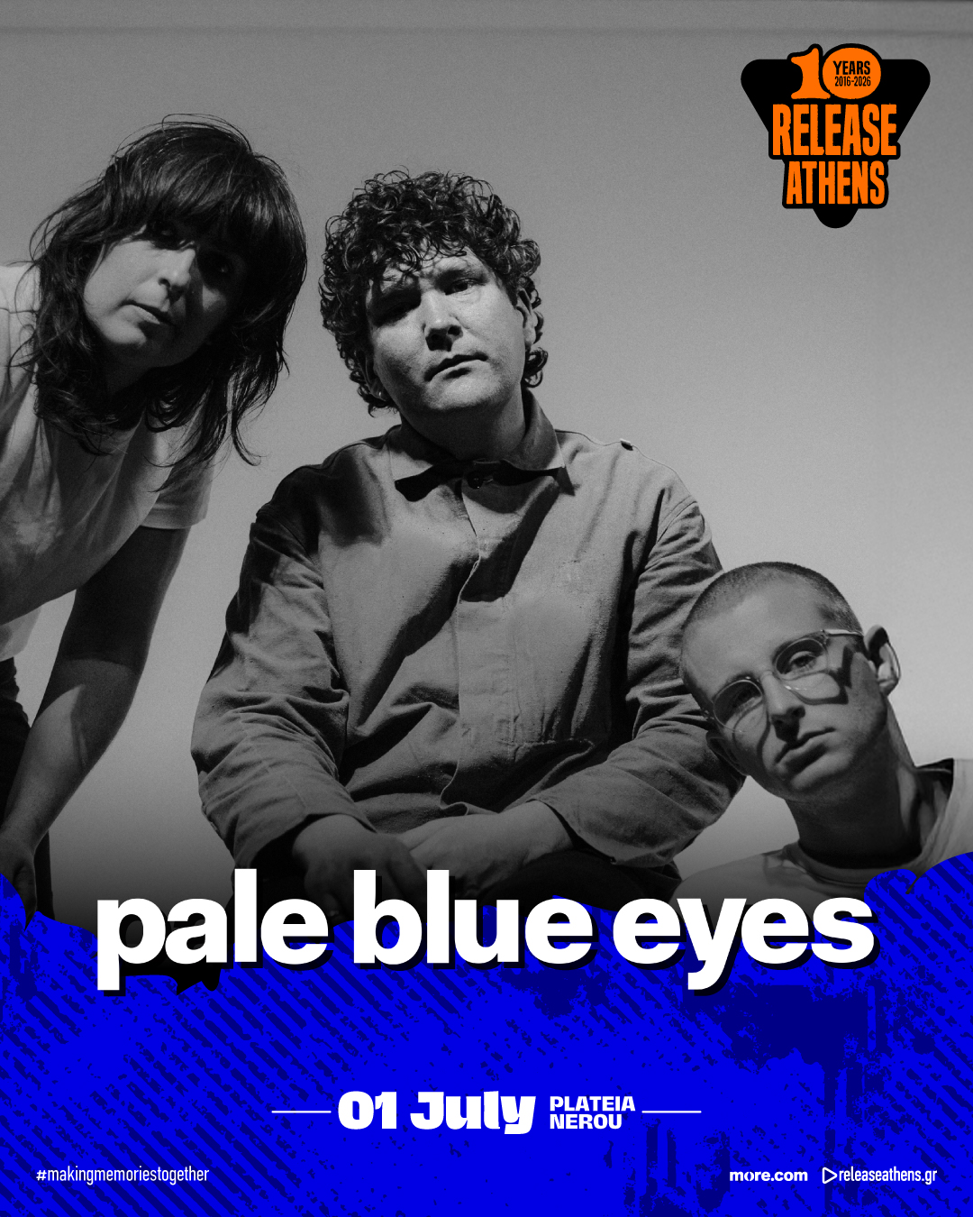 Το Release Athens 2026 υποδέχεται τους Pale Blue Eyes, την Τετάρτη 1 Ιουλίου, στην Πλατεία Νερού. Το βρετανικό σχήμα έρχεται για πρώτη φορά στην Ελλάδα και πλαισιώνει ιδανικά τους Moby και Garbage, συμπληρώνοντας το lineup μιας ξεχωριστής φεστιβαλικής βραδιάς με τον ονειρικό pop ήχο του.