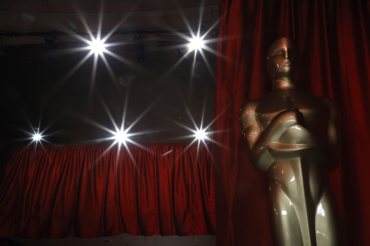 epa10516002 An Oscar statue at the entrance of Orchard Court to the Dolby Theatre during preparations for the 95th annual Academy Awards ceremony at the Dolby Theatre in Hollywood, Los Angeles, California, USA, 11 March 2023. The Oscars are presented for outstanding individual or collective efforts in filmmaking in 24 categories. EPA/JOHN G. MABANGLO