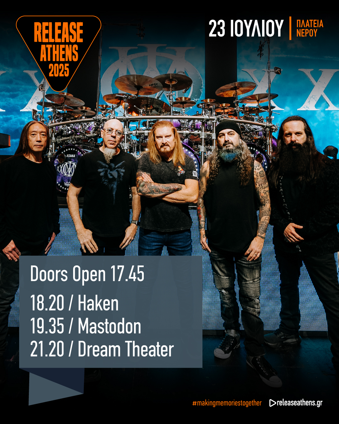 Το Release Athens 2025 υποδέχεται τους Dream Theater, την Τετάρτη 23 Ιουλίου, στην Πλατεία Νερού. Με ολόκληρο το original lineup να δίνει το παρών, μετά τη μεγάλη επιστροφή του Mike Portnoy, οι τεράστιοι Αμερικανοί γιορτάζουν 40 χρόνια ένδοξης πορείας, που σφράγισε ανεξίτηλα το progressive metal, με το μεγαλύτερο show που έχουν πραγματοποιήσει ποτέ! Μαζί τους, μια από τις πιο σημαντικές metal μπάντες της γενιάς τους, οι Αμερικανοί Mastodon και οι Haken, την μπάντα-συνώνυμο του σύγχρονου progressive metal.