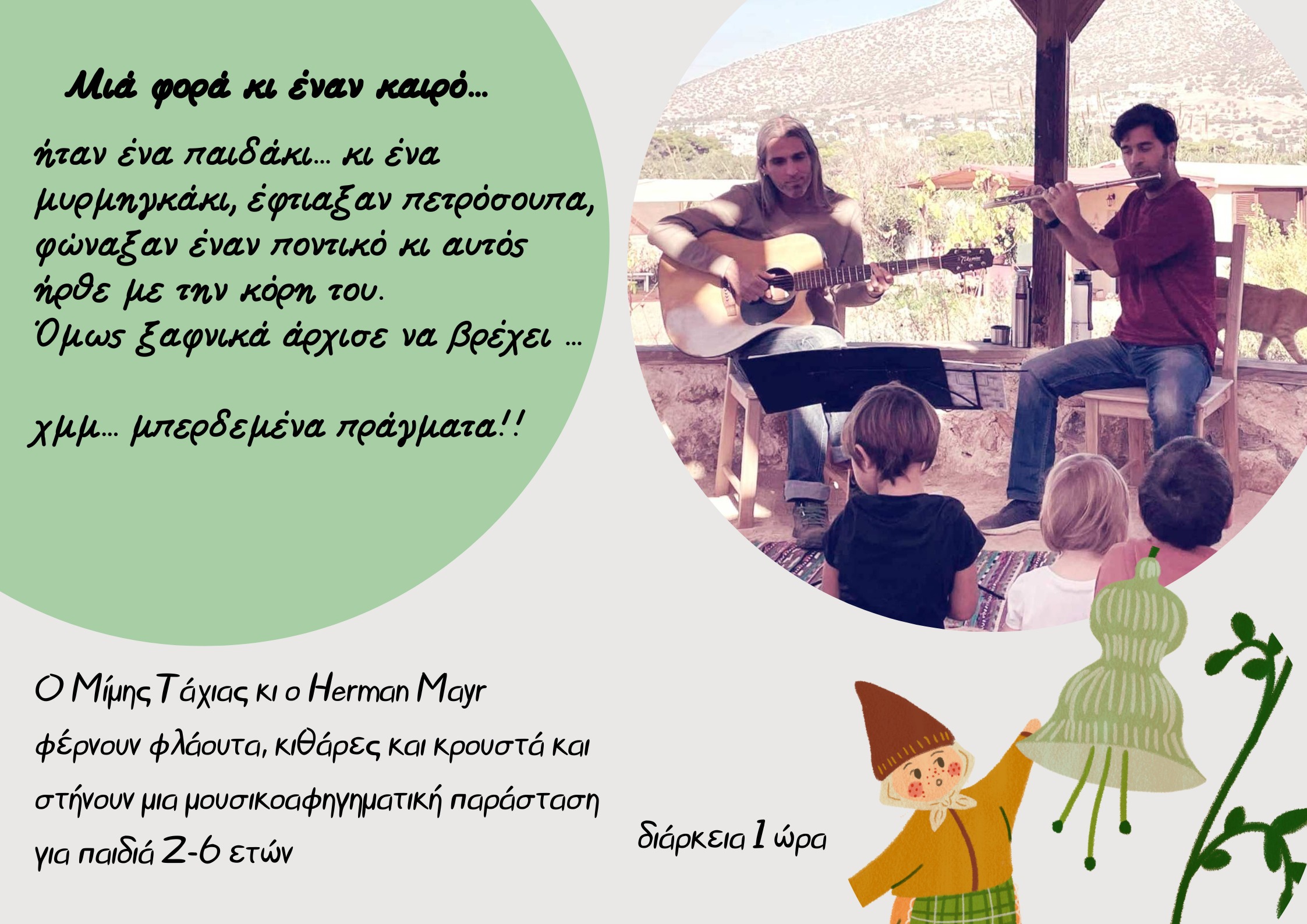 Ο Μίμης Τάχιας κι ο Herman Mayr φέρνουν φλάουτα, κιθάρες και κρουστά και στήνουν μια μουσικοαφηγηματική παράσταση για παιδιά 2-6 ετών.