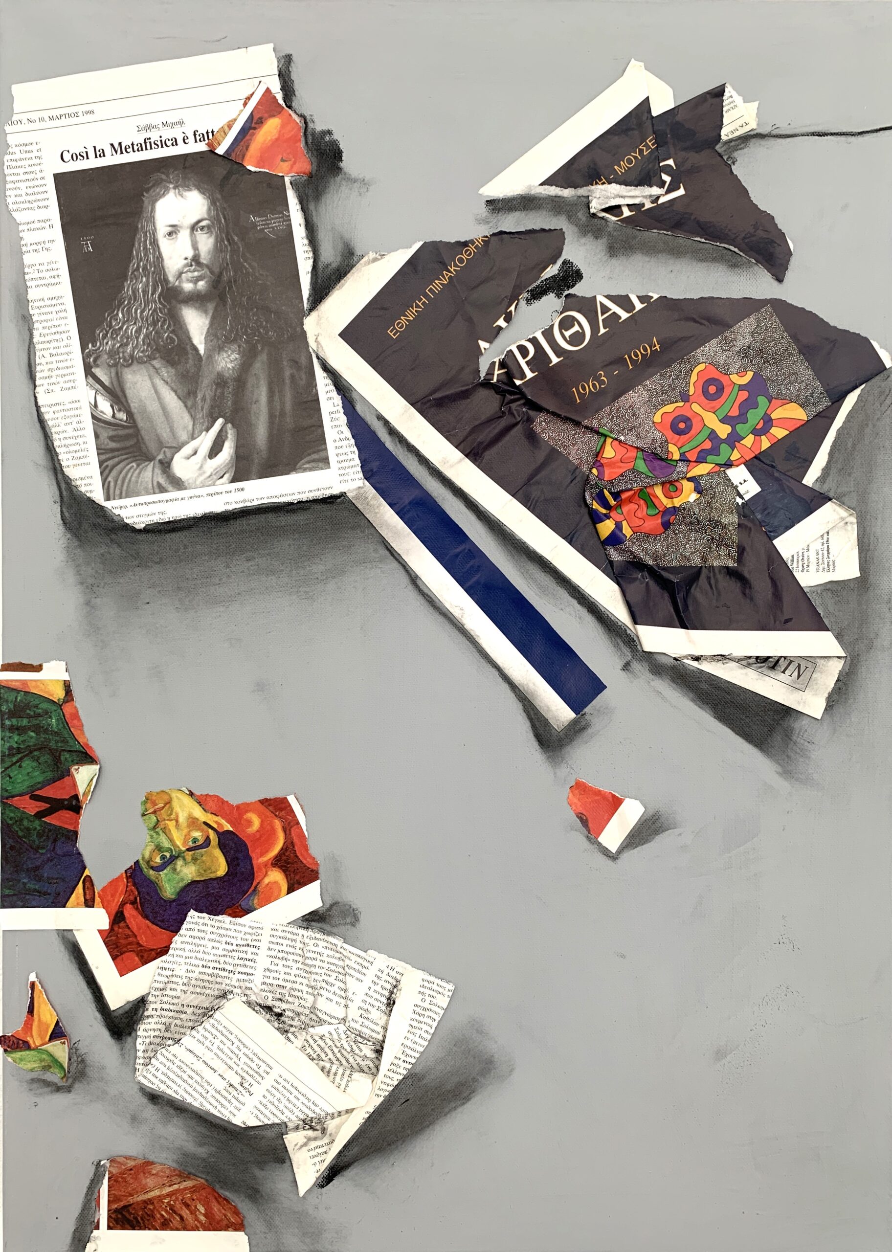 Περιλαμβάνει 24 έργα (κολάζ) συν Ένα, που αποτελεί και το κεντρικό σημείο αναφοράς της Έκθεσης. Πρόκειται για το έργο «Πληροφορίες», του 1972, που έχει παρουσιασθεί στο παρελθόν, σε πολλά μέρη του κόσμου: Γερμανία, Γαλλία, Ιταλία κ.ά. Τα υπόλοιπα 24 αποτελούν νέα έργα, δημιουργημένα ειδικά για την Έκθεση, στα όποια έχει χρησιμοποιήσει τόσο ως θέμα, όσο και ως υλικό, την ίδια την καλλιτεχνική εφημερίδα της περιόδου 1991–2016.