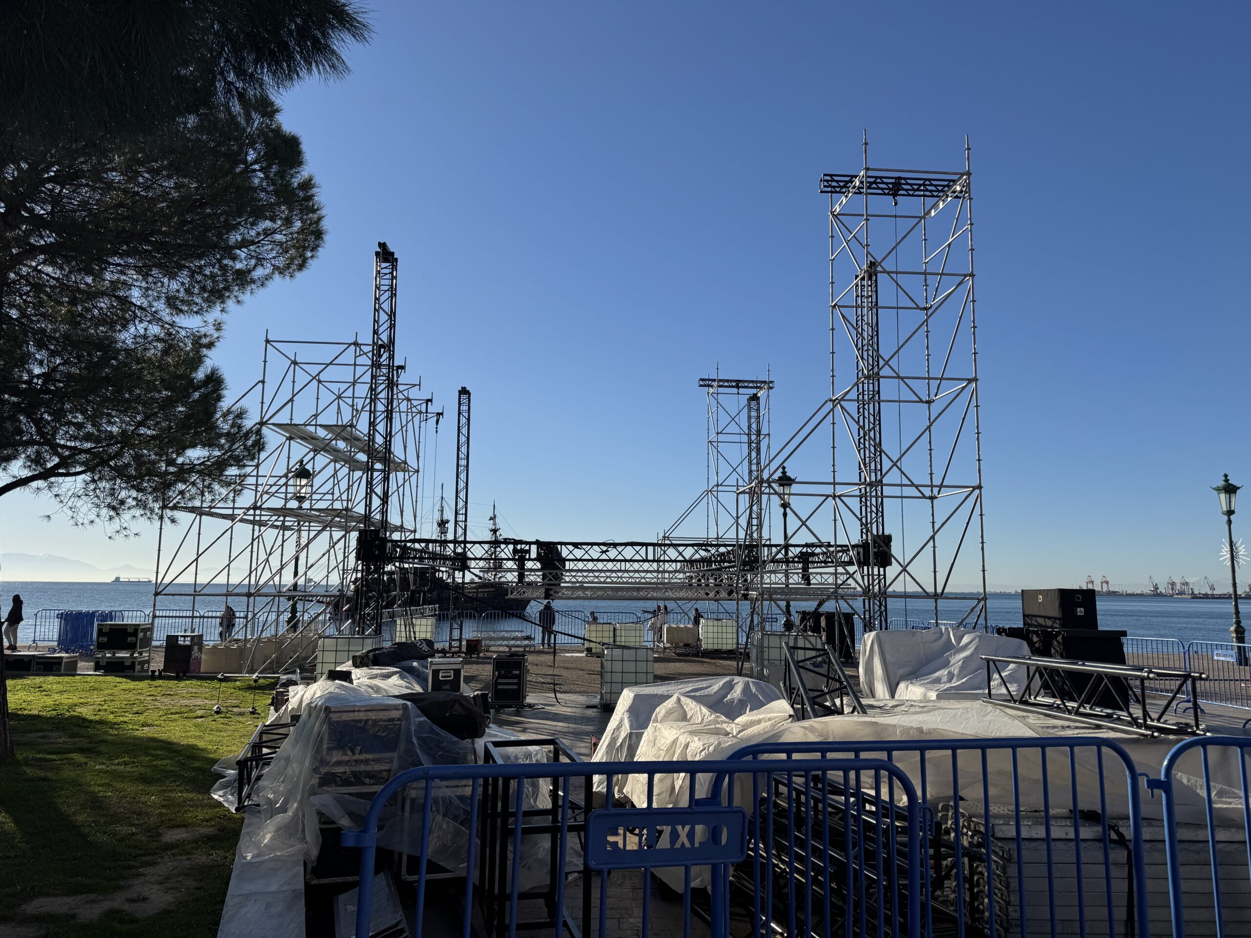 Από το μεσημέρι, συνεργεία του δήμου Θεσσαλονίκης άρχισαν να στήνουν στο παραλιακό μέτωπο τη σκηνή που θα φιλοξενήσει την παραμονή της Πρωτοχρονιάς, από τις 8 το βράδυ, τους κορυφαίους djs, ενώ παράλληλα με γερανό σηκώνονται και δοκιμάζονται τα φώτα που θα «λούσουν» τα πρώτα λεπτά του 2026 τον Λευκό Πύργο.