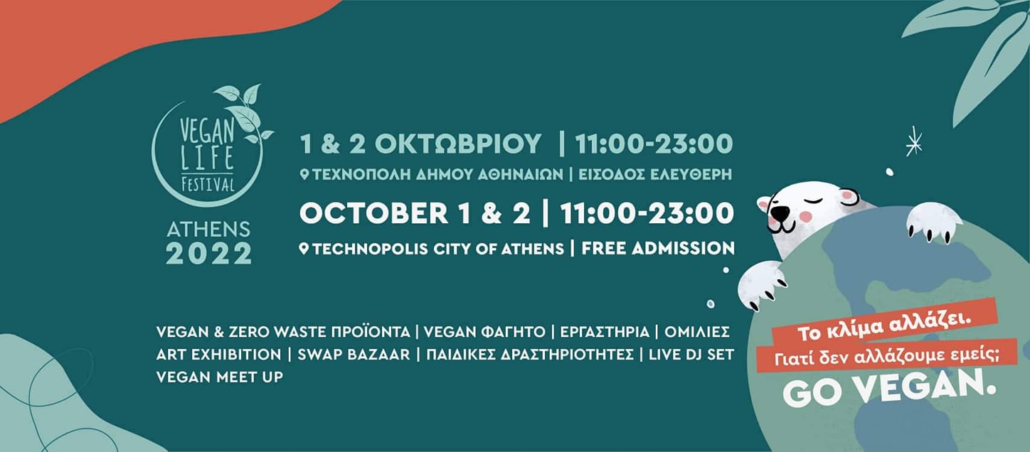 Το Vegan Life Festival Athens ανοίγει τις πόρτες του για μια ακόμη χρονιά, το πρώτο σαββατοκύριακο του Οκτωβρίου, στην Τεχνόπολη Δήμου Αθηναίων, από τις 11:00 το πρωί μέχρι τις 11:00 το βραδυ με ελεύθερη είσοδο!