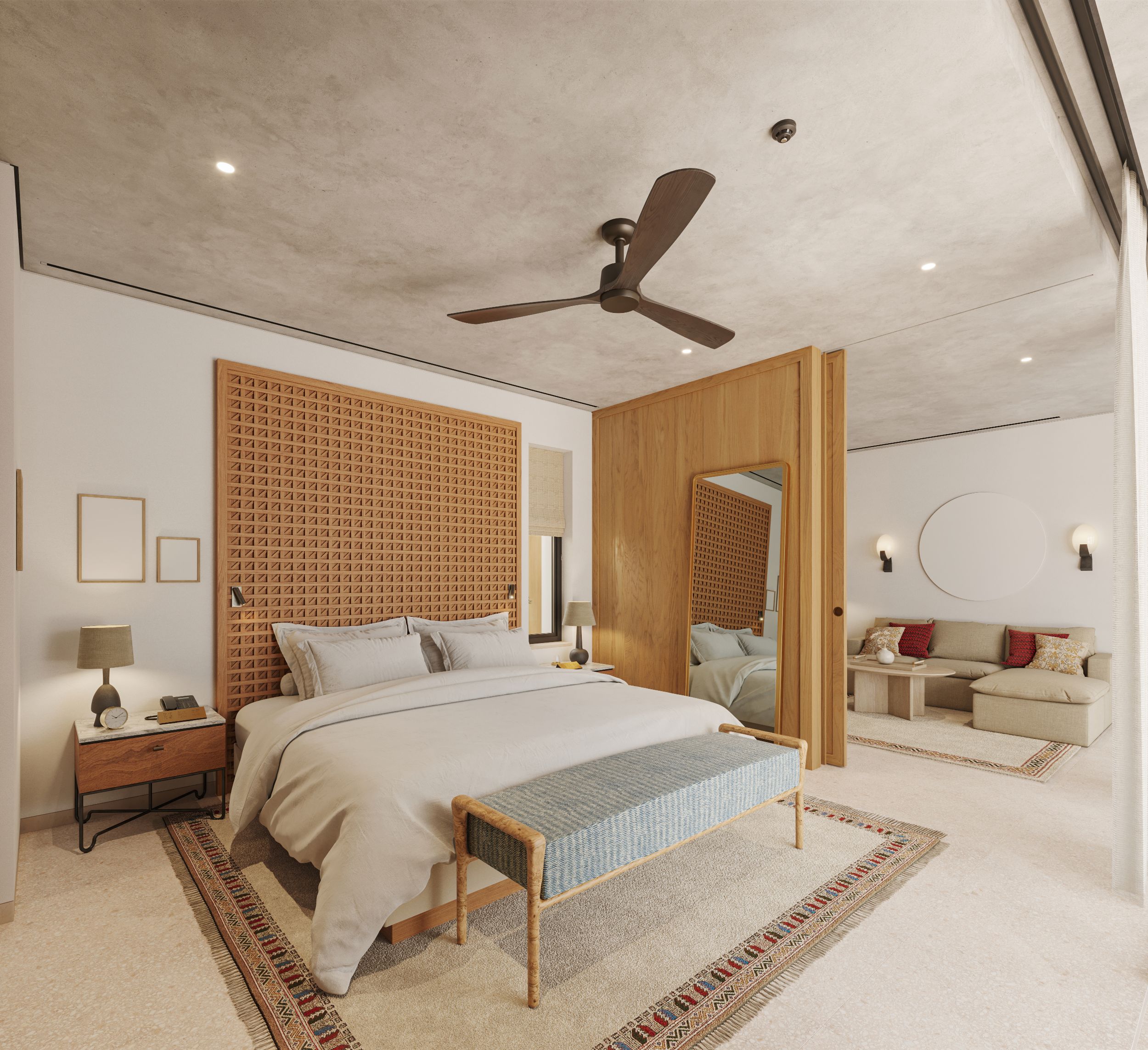 Το resort αγκαλιάζει τη φυσική ομορφιά της Μεσσηνίας με νότες από ενδημικά μεσογειακά φυτά, γήινες αποχρώσεις και κομψές πινελιές χρωμάτων. Η διακόσμηση υμνεί την αρχιτεκτονική και του 19ου αιώνα αντικατοπτρίζοντας τα ιστορικά μνημεία της περιοχής, που δίνουν την έμπνευση για μοτίβα και ξυλόγλυπτα. Οι φυσικές αποχρώσεις της τερακότας δημιουργούν ένα φιλόξενο περιβάλλον με custom-made έπιπλα, παράθυρα που φτάνουν μέχρι την οροφή και state-of-the-art τεχνολογία ψυχαγωγίας. Τα χαλιά σε σουίτες και βίλες είναι επίσης εμπνευσμένα από την ύφανση των παραδοσιακών ελληνικών ενδυμασιών.