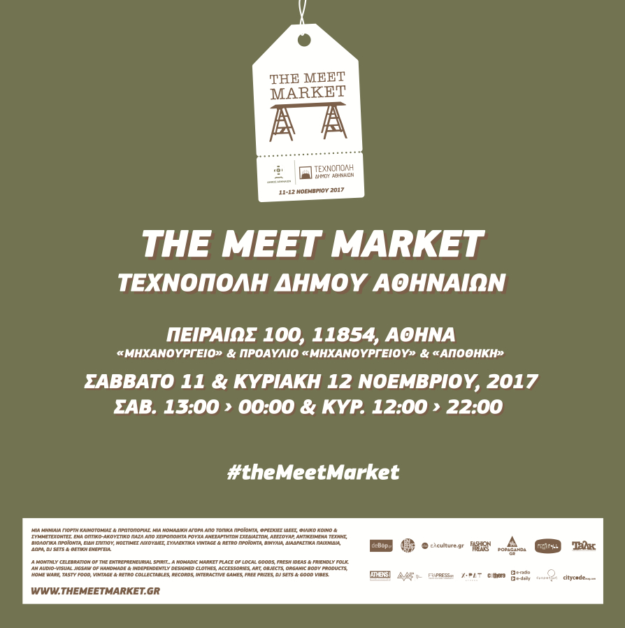 TheMeetMarket: Μια μηνιαία γιορτή καινοτομίας και πρωτοπορίας. Μία νομαδική αγορά από τοπικά προϊόντα, φρέσκες ιδέες, φιλικό κοινό και συμμετέχοντες. Ένα οπτικο-ακουστικό παζλ από χειροποίητα ρούχα ανεξάρτητων σχεδιαστών, αξεσουάρ, αντικείμενα τέχνης, βιολογικά προϊόντα, είδη σπιτιού, νόστιμες λιχουδιές, συλλεκτικά vintage&retro προϊόντα, βινύλια, διαδραστικά παιχνίδια, δώρα, DJ sets και θετική ενέργεια!