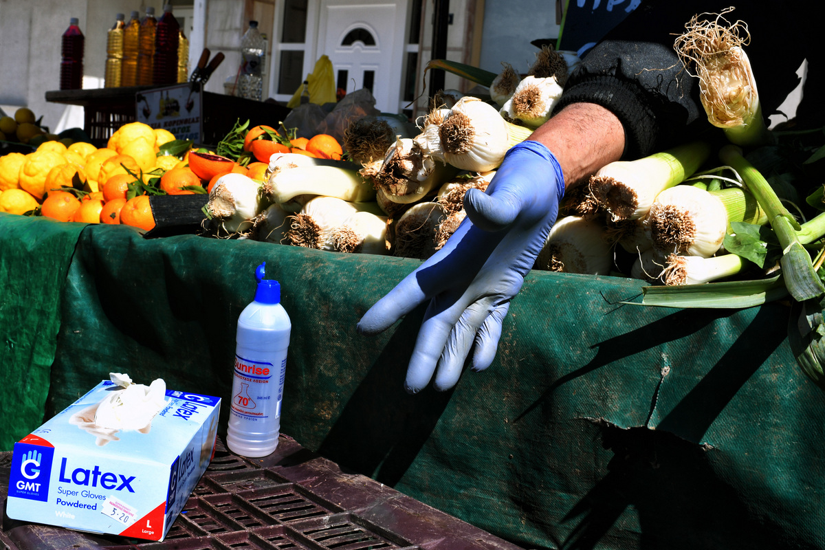 Κουτί με γάντια και αντισηπτικό υγρό σε λαϊκή αγορά στην Κόρινθο, την Τετάρτη 18 Μαρτίου 2020. Ο σύλλογος λαϊκών αγορών Κορίνθου αποφάσισε να πραγματοποιεί απολύμανση κάθε μία ώρα στο χώρο της αγοράς για την προστασία από τον κορονοϊό, των καταναλωτών και των πωλητών, οι περισσότεροι πολίτες φορούσαν μάσκες και γάντια. ΑΠΕ-ΜΠΕ/ΑΠΕ-ΜΠΕ/ ΒΑΣΙΛΗΣ ΨΩΜΑΣ