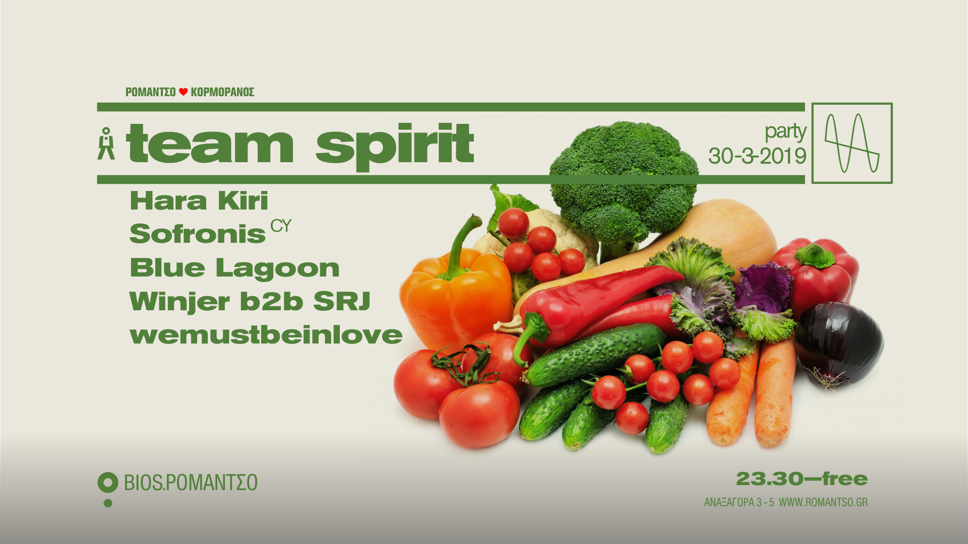 Ένα ακόμα “Team Spirit” party από το Ρομάντσο και τον Κορμοράνο, και συγκεκριμένα το πέμπτο κατά σειρά, θα πραγματοποιηθεί το Σάββατο 30 Μαρτίου 2019, όπου οι Hara Kiri, Sofronis, Blue Lagoon, Winjer b2b SRJ και wemustbeinlove, θα μετατραπούν σε μια μοναδική μουσική οντότητα.