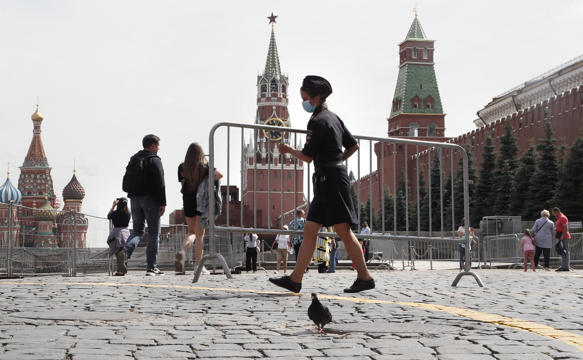 epa08583404 A female police officer wearing a protective face mask moves a temporary fencing on the Red Square in Moscow, Russia, 04 August 2020. Russian authorities continue to gradually ease restrictions imposed to prevent the spread of the pandemic COVID-19 disease caused by the SARS-CoV-2 coronavirus in the country. EPA/MAXIM SHIPENKOV