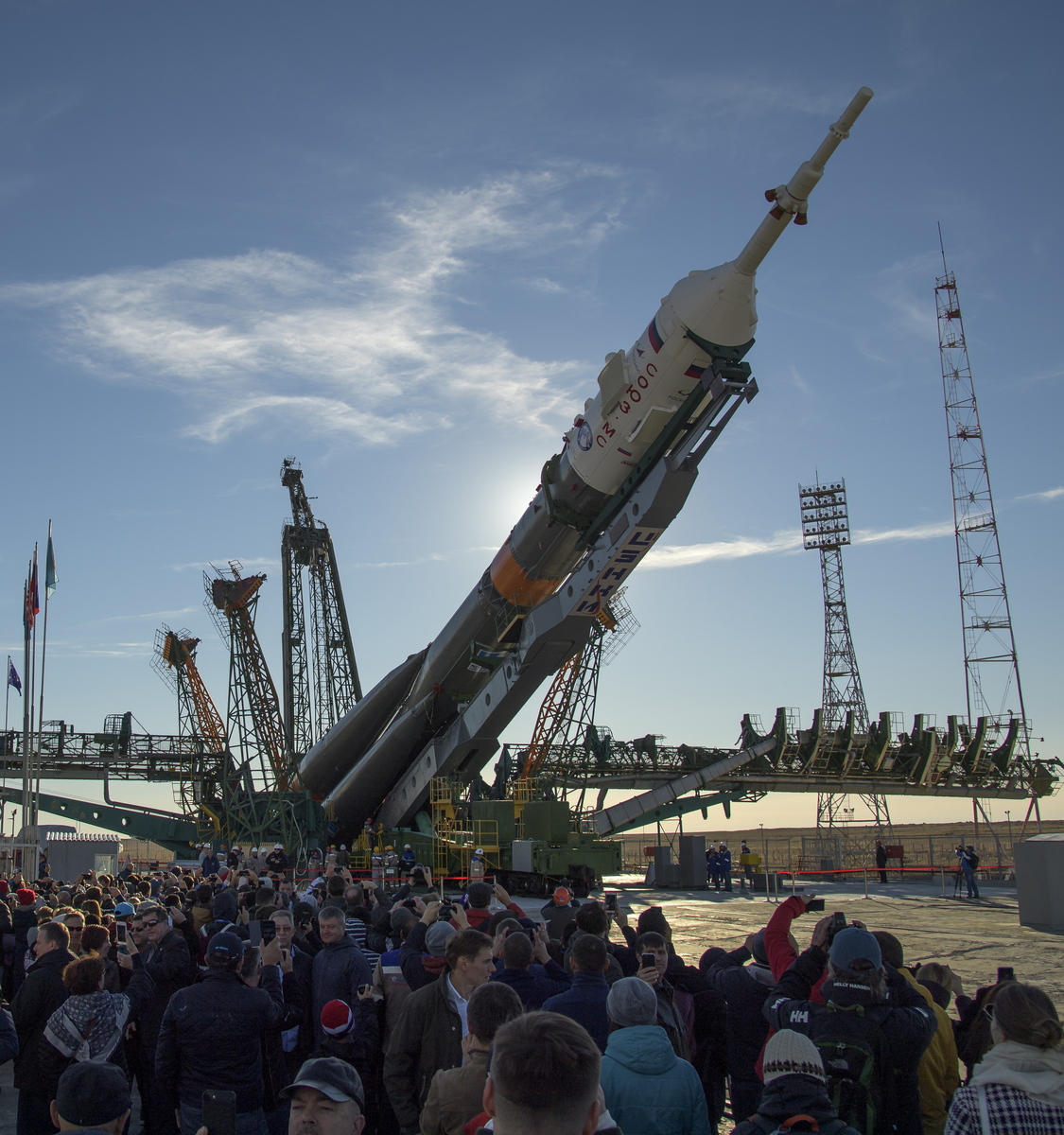 Ο πύραυλος προώθησης Soyuz ανυψώνεται σε κατακόρυφη θέση στην πλατφόρμα εκτόξευσης στο κοσμοδρόμιο του Μπαϊκονούρ στο Καζακστάν.