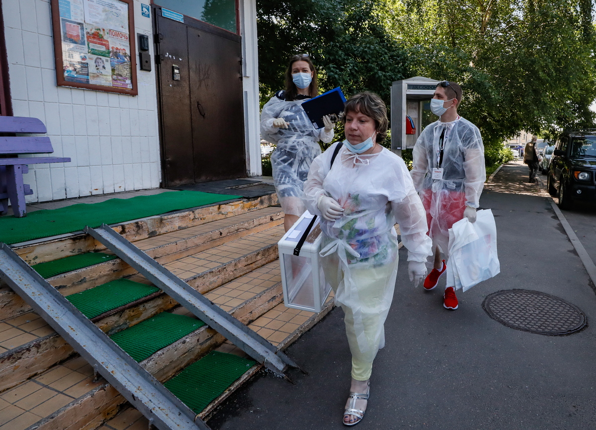 epa08517649 Members of the local election commission wearing protective suits walk on a street carrying a portable ballot box during early voting in a referendum on amendments to the Russian Constitution in Moscow, Russia, 30 June 2020. The nationwide vote on the constitutional reform has started on 25 June and will run for seven days until 01 July. The counting of the total results will begin right after polling stations close on 01 July. The vote had been originally scheduled to take place on 22 April but was postponed due to COVID-19. EPA/YURI KOCHETKOV