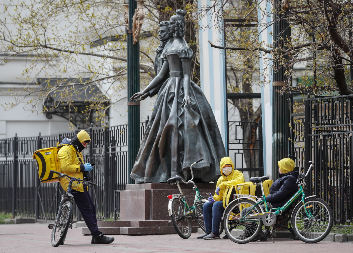 epa08383921 Delivery men waiting for orders by a monument of Russian poet Alexander Pushkin and Natalia Goncharova in an almost deserted Arbat street in Moscow, Russia, 25 April 2020. Many Russians prefer to purchase their food online and have it delivered to their homes in order to avoid doing shopping in person amid the ongoing pandemic of the COVID-19 disease caused by the SARS-CoV-2. EPA/YURI KOCHETKOV