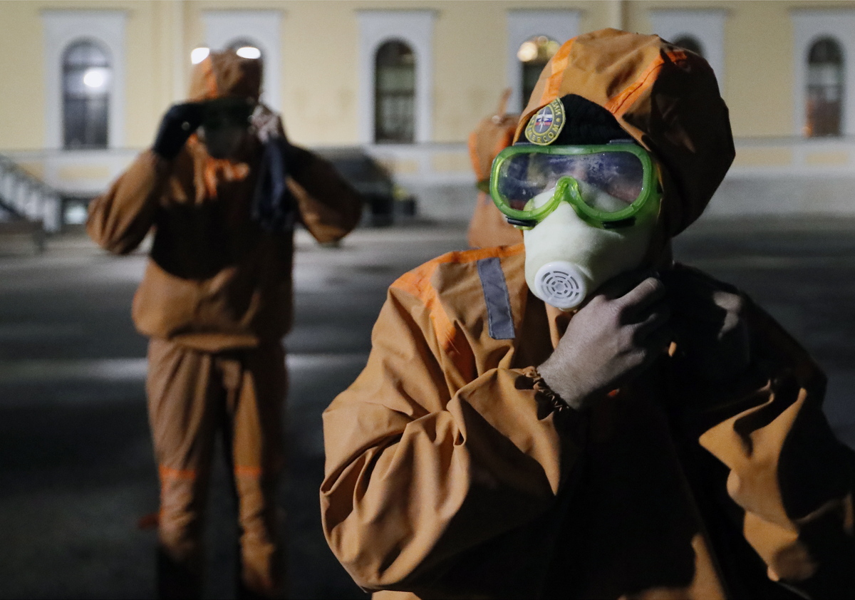 epa08392528 Servicemen of Russia's Emergencies Ministry put on protective suits before a disinfection of the Moskovsky railway station in St. Petersburg, Russia, 29 April 2020. The Russian President extended a home quarantine to 11 May 2020 to prevent the spread of the SARS-CoV-2 coronavirus which causes the COVID-19 disease. EPA/ANATOLY MALTSEV