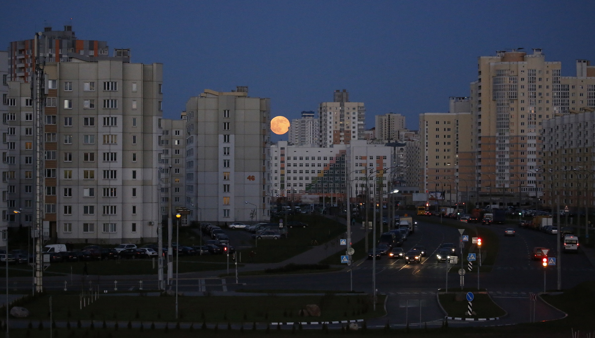 Η πανσέληνος υψώνεται πάνω από τις ψηλές πολυκατοικίες στο Μινσκ της Λευκορωσίας, στις 7 Μαΐου 2020. EPA / TATYANA ZENKOVICH