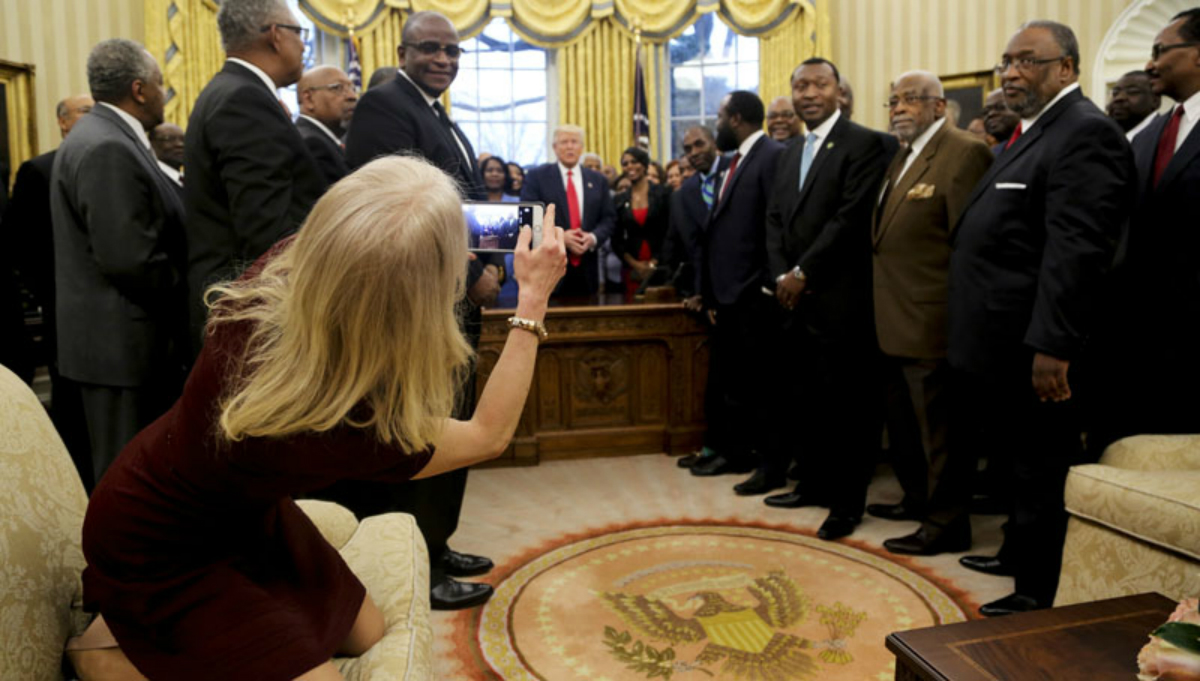 Μια φωτογραφία της στενής συμβούλου του αμερικανού προέδρου Κελιάν Κόνγουεϊ, που τη δείχνει καθισμένη με διπλωμένα τα γόνατα σε έναν καναπέ στο Οβάλ Γραφείο του Λευκού Οίκου προκάλεσε κατακραυγή στα μέσα κοινωνικής δικτύωσης.