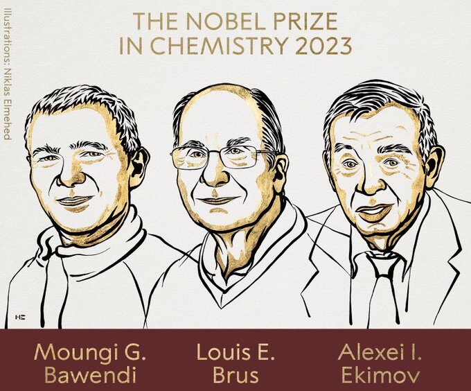 Οι Μούντζι Γκ. Μπαουέντι, Λούις Ι. Μπρους και Αλεξέι Εκίμοφ, τρεις ερευνητές που εργάζονται στις ΗΠΑ, τιμώνται με το φετινό βραβείο Νόμπελ Χημείας για “την ανακάλυψη και την σύνθεση κβαντικών κουκκίδων”, ανακοίνωσε σήμερα η επιτροπή που απονέμει τα Νόμπελ.
