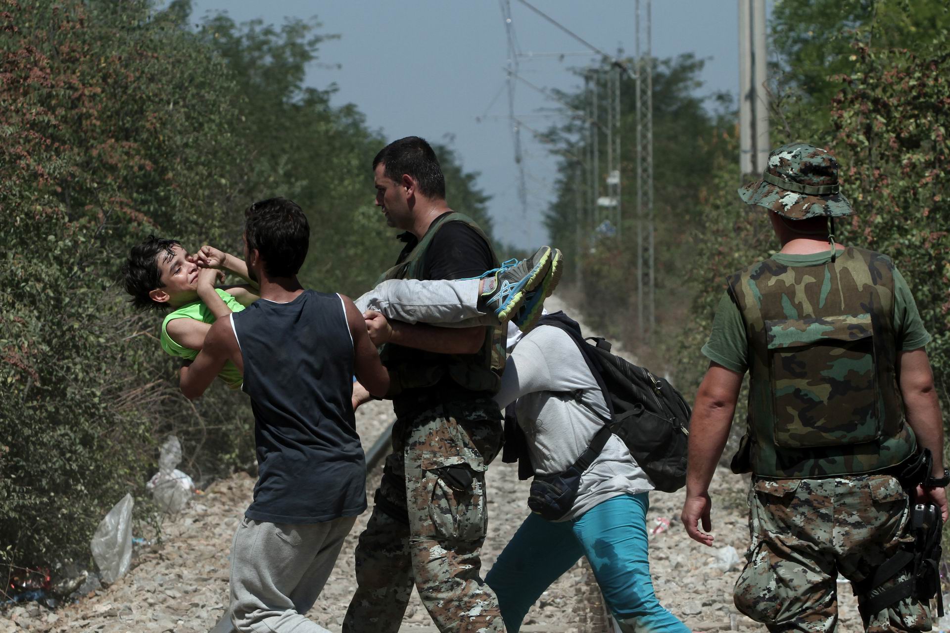 Άντρες περνούν τις γραμμές του τρένου μεταφέροντας εξαντλημένο αγόρι στα χέρια τους. Σύροι πρόσφυγες και μετανάστες απο την Ασία διασχίζουν τα σύνορα στην Ειδομένη, περπατώντας προς τον σιδηροδρομικό σταθμό της πόλης Γεύγελη στη ΠΓΔτΜ, συνεχίζοντας έτσι το ταξίδι τους προς την Σερβία και χώρες της βόρειας Ευρώπης. Την Τρίτη 1η Σεπτεμβρίου 2015.