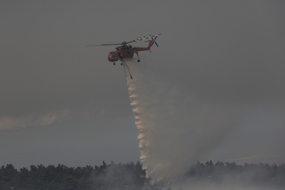 Πυροσβεστικό ελικόπτερο επιχειρεί στην θέση Φλαμπούρι κατά τη διάρκεια δασικής πυρκαγιάς στην Πάρνηθα, Σάββατο 7 Αυγούστου 2021. ΑΠΕ-ΜΠΕ/ΑΠΕ-ΜΠΕ/ΚΩΣΤΑΣ ΤΣΙΡΩΝΗΣ