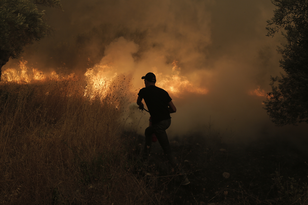 Πολίτης, κρατώντας πυροσβεστήρα, επιχειρεί στην κατάσβεση της πυρκαγιάς στην περιοχή Πευκί στην Βόρεια Εύβοια, Κυριακή 08 Αυγούστου 2021. Ένα τεράστιο μέτωπο της φωτιάς κατευθύνεται αυτή την ώρα στην Γαλατσώνα και βρίσκεται σε απόσταση αναπνοής από το χωριό. Ένα άλλο πύρινο μέτωπο πλησιάζει τις Γούβες σε μία πορεία που οδηγεί στο Αρτεμίσιο, το Πευκί και τη θάλασσα. Λίγο μακρύτερα και από την άλλη πλευρά του νησιού, η φωτιά κινείται κατευθείαν προς τους Καματριάδες και τους Γαλατσάδες - και αν περάσει από αυτά τα δύο κομβικά σημεία, πλέον θα βρεθεί πάνω από την Αιδηψό. Στο νότιο τμήμα, οι υποστηρικτικές ομάδες πυροπροστασίας που έχουν φτάσει στη χώρα μας από την Ουκρανία και την Ρουμανία και εργάζονται νυχθημερόν, ελέγχουν την κατάσταση στο χωριό Τρούπι, όσο και λίγο πιο βόρεια, στα Καλύβια και στο Σπαθάρι. ΑΠΕ-ΜΠΕ/ΑΠΕ-ΜΠΕ/ΚΩΣΤΑΣ ΤΣΙΡΩΝΗΣ