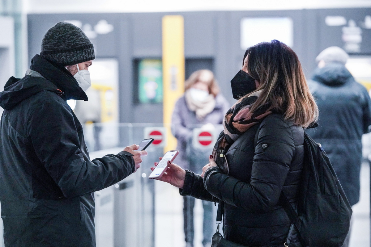 epa09676808 Traffic police and GTT (Public Transport Company) officers check green pass of public transport, tram, bus and subway passengers in Turin, Italy, 10 January 2022. EPA/Tino Romano