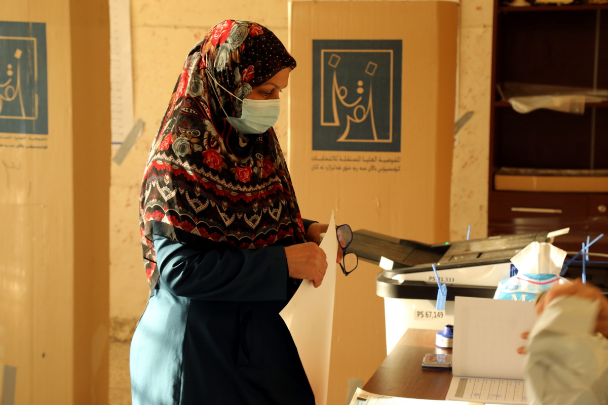 epa09516757 An Iraqi woman casts her ballot during the parliamentary election at a polling station in Baghdad's Sadr district, Iraq on 10 October 2021. Iraqis are to elect the new 329 members of the Council of Representatives (CoR) in 83 electoral constituencies in 18 governorates. EPA/AHMED JALIL