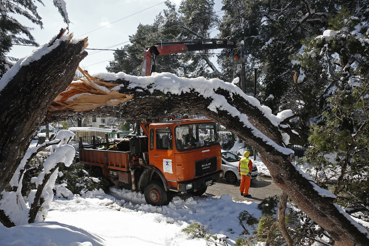Μέλη συνεργείων αποκατάστασης βλαβών της ΔΕΔΔΗΕ και του ΠΣ επιχειρούν σε περιοχή της Εκάλης, προκειμένου να λυθούν τα μεγάλα προβλήματα που άφησε η κακοκαιρία "Μήδεια" σε ηλεκτρικό ρεύμα, νερό και συγκοινωνίες, Τετάρτη 17 Φεβρουαρίου 2021. ΑΠΕ- ΜΠΕ/ΑΠΕ- ΜΠΕ/ΑΛΕΞΑΝΔΡΟΣ ΒΛΑΧΟΣ