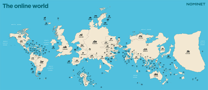 Τον παγκόσμιο χάρτη με τα μεγέθη των χωρών ανάλογα με το πόσες ιστοσελίδες φιλοξενούν, παρουσιάζει η βρετανική εταιρεία Nominet. To νησάκι με την κατάληξη .tk που φαίνεται τεράστιο, είναι ένα μικρό νησί στο νότιο Ειρηνικό με το όνομα Τόκελαου και πληθυσμό 1.400 κατοίκων. Έχει περισσότερες από 31 εκατ. ιστοσελίδες. Γιατί; Γιατί είναι δωρεάν.