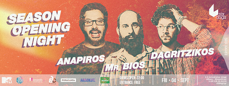 Ο Κωνσταντίνος Δαγριτζίκος (six d.o.g.s), ο Βασίλης-Mr. Bios-Χαραλαμπίδης (bios, Ρομάντσο) και ο Δημήτρης-Ανάπηρος-Αναγνώστου (Kitty Cat, Κύριος) γνωρίζονται χρόνια. Και συμπαθιούνται. Δαιμόνιοι υπερασπιστές του καλού (γούστου) συνηθίζουν να ανταλλάσσουν επισκέψεις στις έδρες ο ένας του άλλου δεν είχε τύχει όμως ποτέ να συνυπάρξουν δημιουργικά. Μέχρι τώρα. Γιατί τώρα είναι η ώρα της έναρξης της νέας σεζόν του six d.o.g.s κι αυτός είναι λόγος γιορτής. Και που ξέρει κανείς, μπορεί ετούτο το…franchise να μεταφερθεί κι αλλού κατά τη διάρκεια της σεζόν.